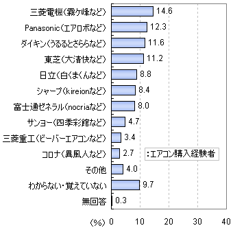 〔(エアコンを購入したことがある人)あなたのご家庭で購入したエアコンは、どのメーカー(ブランド)のものですか。2台以上お持ちの方はもっとも最近購入したエアコンについてお答えください〕