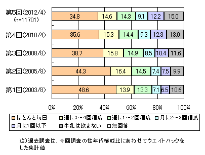 牛乳を飲む人は85.0%で、「ほとんど毎日飲む」が34.8%です。過去調査と比較すると、牛乳を飲む人の比率は減少傾向です。