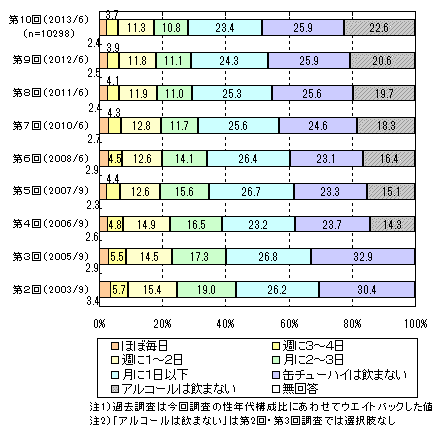 缶チューハイ飲用者は51.5%、週1日以上飲用者は17.4%です。過去調査と比較すると、飲用者は年々減少傾向にあります。男性は30・40代、女性は20代で、飲用者が多い傾向です。