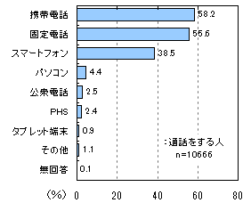 通話する人が利用する機器は「携帯電話」「固定電話」が各6割弱、「スマートフォン」が4割弱となっています。