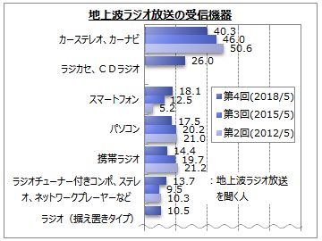 地上波ラジオ放送の受信機器は、「カーステレオ、カーナビ」が聴取者の40.3%、「ラジカセ、CDラジオ」が26.0%、「スマートフォン」「パソコン」が各2割弱、「携帯ラジオ」「ラジオチューナー付きコンポ、ステレオ、ネットワークプレーヤーなど」「ラジオ(据え置きタイプ)」が1割強となっています。「スマートフォン」は10・20代では4割強と1位です。「カーステレオ、カーナビ」は40・50代、特に男性40・50代で比率が高くなっています。