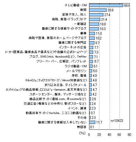 | 健康に関する情報入手先は「テレビ番組・CM」が最も多く、「新聞」「家族や友人、知人」「病院、薬局・ドラッグストア」「一般雑誌」「健康に関する情報サイトやブログ」などが続く。健康に関して情報発信をしたことがある人は3割、「家族や友人・知人と話題にする」が2割強、「ブログやホームページに投稿・コメントする」が5.4% |