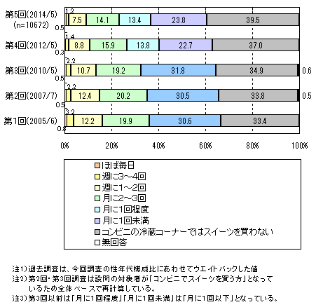 コンビニの冷蔵コーナーのスイーツ購入頻度は「月に1回未満」がボリュームゾーンです。週1回以上買う人は全体の1割弱で、過去調査と比べ減少傾向がみられます。