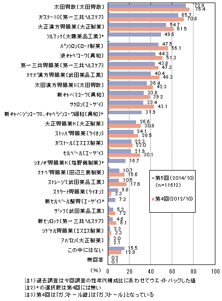 市販の胃腸薬の認知率は「太田胃散」「ガスター10」が各7割でトップ2です。「大正漢方胃腸薬」「ソルマック」「パンシロン」が各5割、「液キャベコーワ」「第一三共胃腸薬」「タケダ漢方胃腸薬」「太田漢方胃腸薬II」が各4割で続きます。2012年と比較すると「パンシロン」「サクロン」「セルベール」などがやや減少しています。