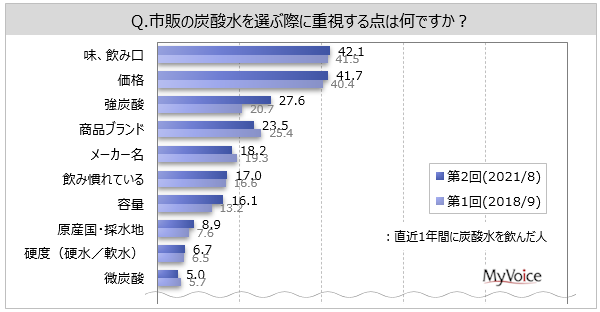直近1年間に炭酸水を飲んだ人に、市販の炭酸水を選ぶ際の重視点を聞いたところ(複数回答)、「味、飲み口」「価格」が各4割強、「強炭酸」が27.6%、「商品ブランド」「メーカー名」「飲み慣れている」が2割前後です。2018年調査と比べて、「強炭酸」がやや増えています。また、炭酸水が好きな層や飲用頻度が高い層では、「強炭酸」の比率が高い傾向です。