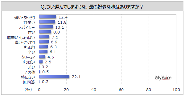 つい選んでしまうような、最も好きな味は「薄い・あっさり」「甘辛い」が各1割強、「スパイシー」が10.1%です。男性10・20代では「濃い・こってり」、女性10〜30代では「甘い」が高くなっています。「薄い・あっさり」は、女性や高年代層で高い傾向です。