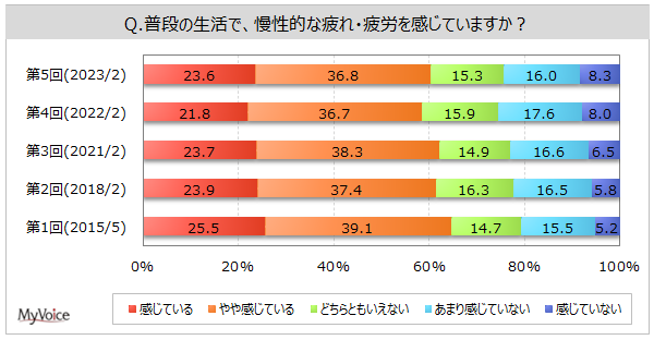 | マイボイスコム株式会社(東京都千代田区、代表取締役社長:高井和久)は、5回目となる『疲れ・疲労』に関するインターネット調査を2023年2月1日〜5日にMyVoiceのアンケートモニターを対象に実施し、9,962件の回答を集めました。調査結果をお知らせします。 【調査結果詳細】 https://myel.myvoice.jp/products/detail.php?product_id=29508 |