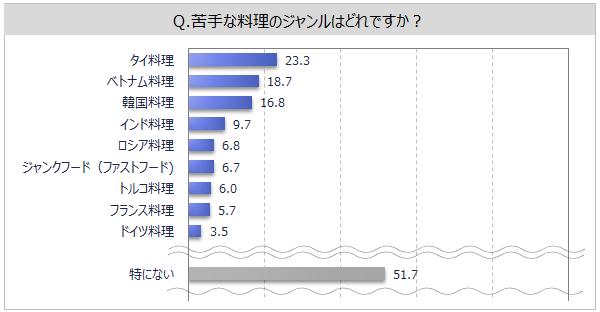 苦手な料理のジャンルを聞いたところ(複数回答)、「特にない」が半数強です。上位としては、「タイ料理」「ベトナム料理」「韓国料理」が2割前後となっています。